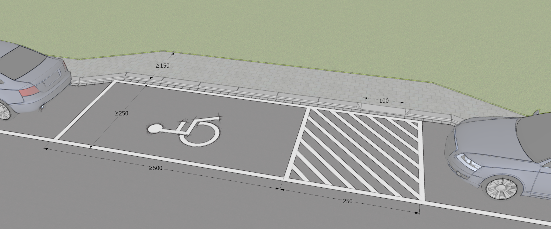 (2) La bande de stationnement réservée aux personnes handicapées a une largeur de 250 cm si la largeur restante du trottoir est supérieure ou égale à 150 cm.